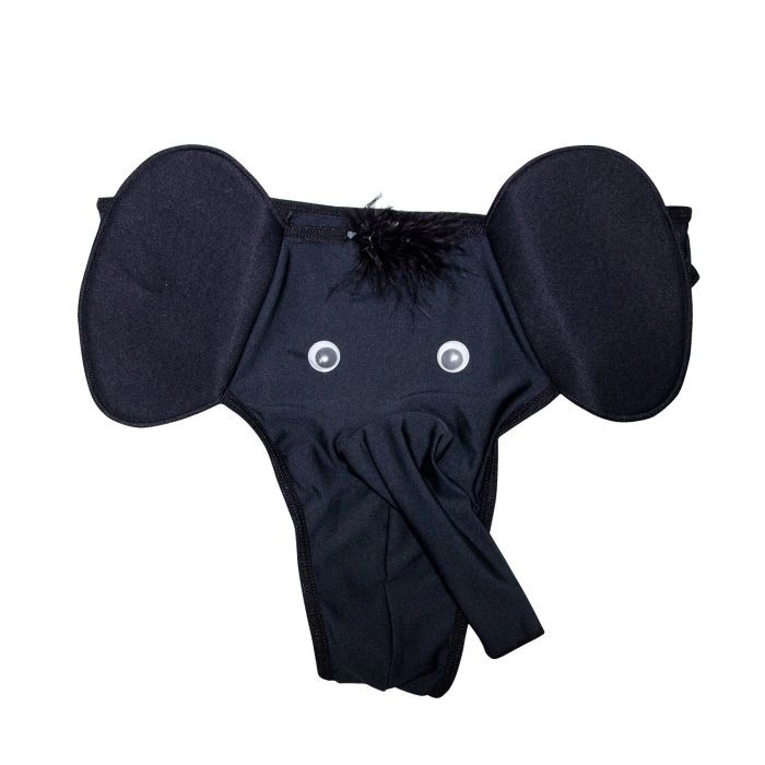Cueca com abertura do lado de dentro que dá acesso a tromba do elefante. A ponta da tromba também possui abertura.